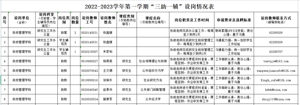 bv伟德国际1946官网2022-2023学年第一学期“三助一辅”设岗情况表