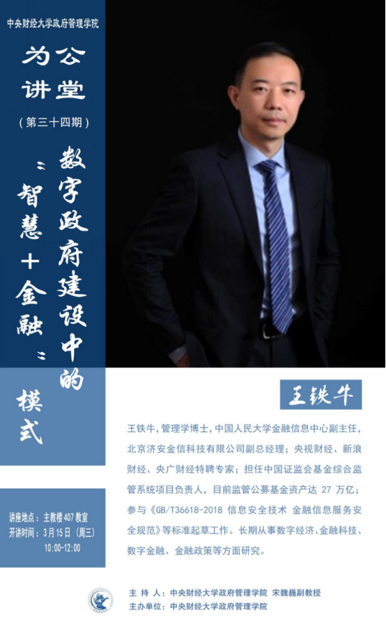 嘉宾简介:王铁牛,管理学博士,中国人民大学金融信息中心副主任,北京济安金信科技有限公司副总经理;央视财经、新浪财经、央广财经特聘专家;担任中国证监会基金综合监管系统项目负责人,目前监管公募基金资产达27万亿;参与《GB/T36618-2018 信息安全技术 金融信息服务安全规范》等标准起草工作。长期从事数字经济、金融科技、数字金融、金融政策等方面研究。
