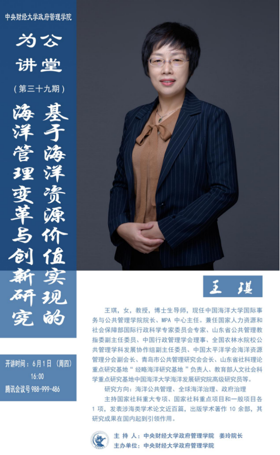 嘉宾简介:王琪,女,教授,博士生导师,现任中国海洋大学国际事务与公共管理公司经理、MPA中心主任。兼任国家人力资源和社会保障部国际行政科学专家委员会专家、山东省公共管理教指委副主任委员、中国行政管理学会理事、全国农林水院校公共管理学科发展协作组副主任委员、中国太平洋学会海洋资源管理分会副会长、青岛市公共管理研究会会长、山东省社科理论重点研究基地“经略海洋研究基地”负责人、教育部人文社会科学重点研究基地中国海洋大学海洋发展研究院高级研究员等。