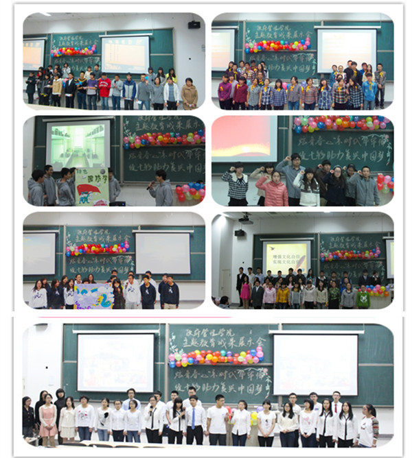 此次主题教育成果展示以班级为单位进行,来自12、13级七个班级的各团支部分别被分到红橙黄绿青蓝紫七种颜色作为本次活动的主题颜色。经过各班为时两周的精心准备,呈现在大家面前的是风格迥异的却又有着同样精彩的表演,不管是情感饱满的诗歌朗诵、积极悦耳的班歌,还是高端大气寓意深刻的展板、幽默风趣又不失深度的情景剧都让大家享受了一场视听盛宴。班级的创新和集思广益充分体现在本次形式多样、高效高质的的展示会中,充满青春气息的展示体现和传递的正能量感染着在场的每一个人。此次班级展示充分体现了班级的团结程度,几乎所有班级都是全员参加,各位同学为班集体的荣誉努力贡献着自己的力量。