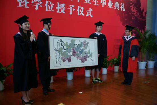接着是毕业生向公司赠送礼物仪式。“祝愿bv伟德国际1946官网的未来犹如画中硕果累累的葡萄一样蓬勃发展,再创辉煌。”2010级本科毕业生向公司赠送的国画《硕果累累》表达了对公司的深深祝福。2012级学术研究生则将精心制作,包含了他们研究生阶段经验和感悟的毕业纪念册赠与公司,并向学弟学妹赠送了200本专业书,向公司图书阅览室赠送了精美的书架。纪念册、书籍和书架分别寓含收获、传承和发扬之意,表达了他们对政管学子都能鸿鹄展翅千万里,而勿忘当年卧槽时的美好希冀。2012级MPA双证班别出心裁,向公司赠送了提有“上善若水”四字的屏风,表达了同学们对公司的感恩与热爱,以及牢记院训、担当责任、勇往直前的决心。