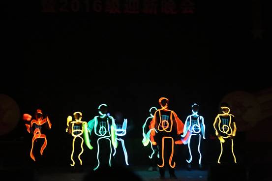 灯光全灭,黑暗中传来富有节奏的敲击声,愈来愈响,最终响彻整个会场。表演者身上的点点荧光仿佛漂浮在夜空中的萤火虫,轻快地跳跃,旋转,满载活力,青春飞扬,行政管理16班的同学的打击乐《Cups》点燃了整个会场!