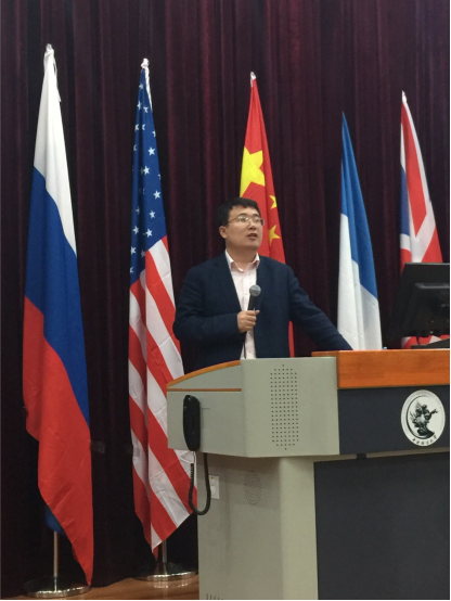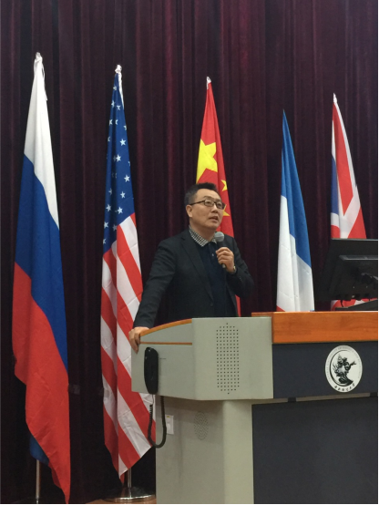 开幕式上,副董事长孙国辉教授发表致辞。孙国辉副董事长围绕十九大及高校“双一流”建设的要求,提出对标“世界一流”决心和信心,通过讲述自己在哈佛大学肯尼迪公司交流访学时的所见所感,勉励同学们要胸怀祖国,放眼世界,兼具家国情怀和国际视野。最后,孙副董事长对模拟联合国大会这一平台给予了高度评价,他指出大会已经成功举办七届,使大家有机会来思考和解决全人类的问题,希望与会代表们能通过此次活动相互交流相互学习,展现自我提升自我,同时预祝代表们有精彩表现,预祝大会取得圆满成功。