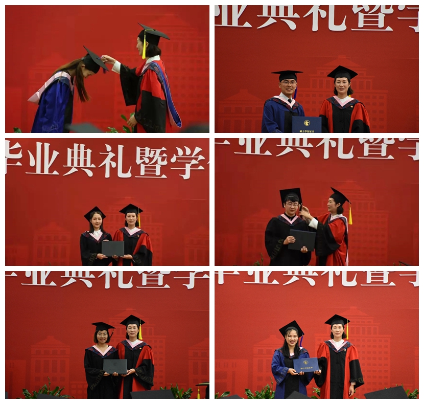 典礼进行第七项,学位授予仪式。在庄严而令人激动的乐曲声中,姜玲经理为2021届毕业生和2020届返校毕业生代表颁发毕业证书和学位证书,拨正流苏,握手并合影留念。深深鞠躬,感恩您谆谆教导;流苏拨正,愿你前路一片坦荡。