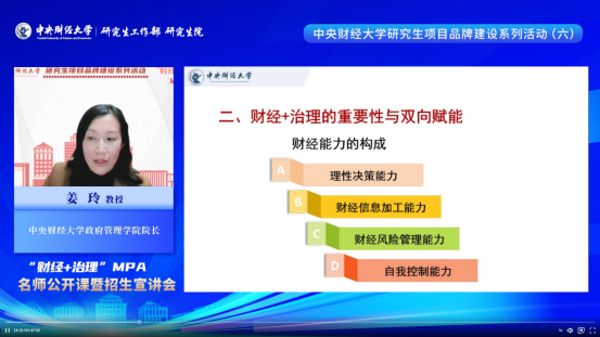 bv伟德国际1946官网经理姜玲教授以“提高财经素养,赋能公共治理”为题,围绕MPA教育的使命和趋势、财经+治理的重要性及双向赋能、财经+治理的内容供给三方面内容,为大家带来了一节干货满满的主题公开课。姜经理指出,面对百年未有之大变局、新技术快速迭代以及新时代新征程新发展阶段的时代背景,复合型知识体系和技能体系、国际和国家战略视野成为现代化公共管理人才的基本素质。公共管理从业者不仅需要遵循公共价值的基本导向,掌握公共管理基础知识体系,还要兼具数智技术与财经领域的工具技能。作为中国财经管理专家的摇篮,中财MPA充分发挥公司特色学科优势,聚焦财经+治理,为MPA人才培养提供特色鲜明的综合性知识供给,围绕财经知识体系、话语体系与能力提升构建系统性培养体系,全面赋能员工成长。最后,姜教授欢迎广大考生积极报考中财MPA,在财经管理专家的摇篮中实现财经+治理的双向赋能,成为懂治理、懂财经的复合型高级人才。