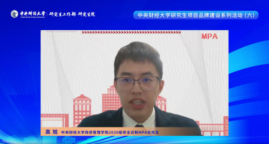 在校生高旭结合自身工作分享了选择报考中财MPA的原因与求学的感触。经过中财MPA的学习,他体会到公共管理基础知识理论与日常工作息息相关。他特别提到在中财MPA与同学们组队参加中国研究生公共管理案例大赛的经历,参加案例大赛不仅让他在全国性比赛中充分展示自我、获得最佳案例、二等奖等殊荣,也是理论与实践结合、学以致用的最好体现。