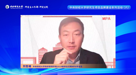 刘哲峰从自己的求学与职业经历谈起,将自己在中财MPA的求学经历总结为“找到了一种感觉”。这种感觉具体体现在他找到了学习的感觉,获得了一张可以安心学习的“课桌”,践行了终身学习的理念;找到了老师的感觉,遇到了诸多学识渊博且真性情的老师;找到了同学的感觉,在多元世界里遇到志同道合的伙伴,找到共同的价值,即使毕业十余年仍情谊深厚。最后他还勉励各位考生,在人生中应做有心人、做困难事、做大格局,通过个人奋斗实现自我、社会与国家的共同发展。