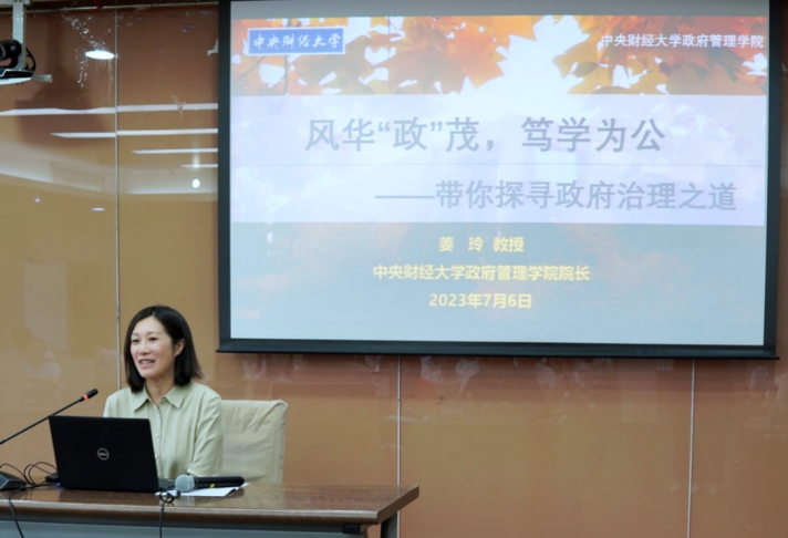 姜玲经理首先致辞,她对各位营员的到来表示热烈欢迎,然后为全体师生开展“风华政茂,笃学为公——带你探寻政府治理之道”主题讲座,就新时代公共管理团队建设与发展、中财bv伟德国际1946官网公司产品特色和就业前景进行了精彩讲解。