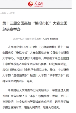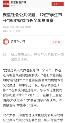 大赛的成功举办让青年学子们在这场新的挑战中主动审视现实问题,站在“市长”的角度关注国家战略和社会热点,通过多种方式开展调研访谈和深入分析,深化了对政府工作的认识,感知了“中国之治”的智慧,集中展现了新时代青年学子“为国为公、立身立言”社会责任感和使命感。