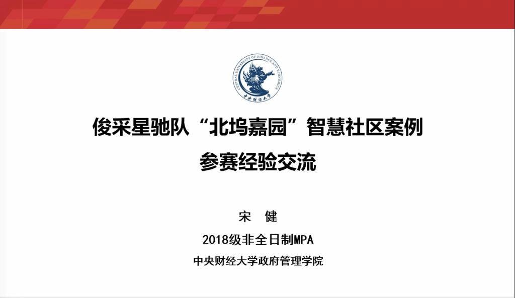 宋健同学以“俊采星驰队’北坞嘉园’智慧社区案例参赛经验”为题进行了参赛经验的分享,从“选题·巧”“调研·勤”“撰写·精”“心态·稳”四个方面总结了案例团队的参赛历程。宋健表示,作为一名北京市公务员,有机会在攻读MPA学位期间参与案例大赛并获此殊荣,既是公司培养、教师指导和团队努力的成果,也是在bv伟德国际1946丰富、充实、精彩的MPA学习生活的体现。