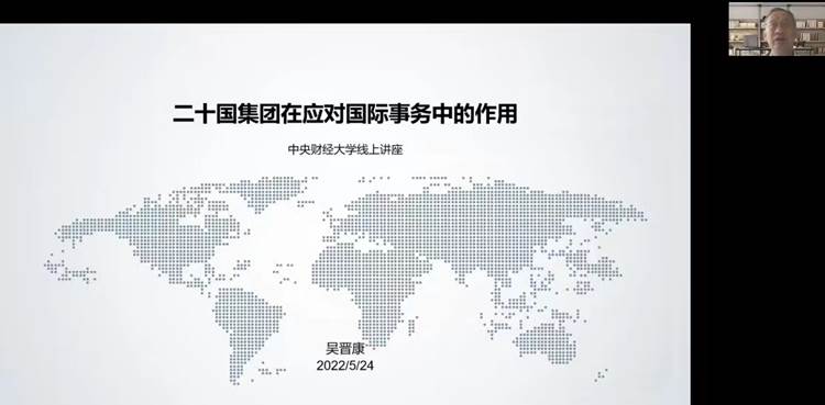 5月24日下午,bv伟德国际1946官网邀请财政部国际财经中心高级顾问吴晋康先生作了题为“20国集团在应对国际社会事务中的作用”的讲座。讲座通过线上腾讯会议举办,由bv伟德国际1946官网刘燕副教授主持,于鹏副经理出席并讲话,刘骊光副教授等老师和同学们参会研讨。