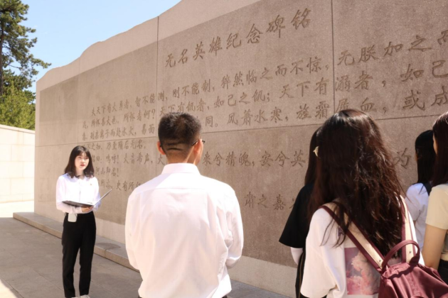 听完英雄们的事迹后,全体同志来到塑像背后,朗诵纪念碑文。无名英雄们“风萧水寒,旌霜履血,或成或败,或囚或殁,人不知之,乃至陨后无名”,然而“长河为咽,青山为证;岂曰无声?河山即名”。在烈日之下,同志们被无名英雄的事迹所深深触动。此时此刻,纪念那些为祖国统一而牺牲的无名英雄们,既是对英烈的告慰,对一段曾经的峥嵘岁月的缅怀,更是对今人和后人的激励和警醒。